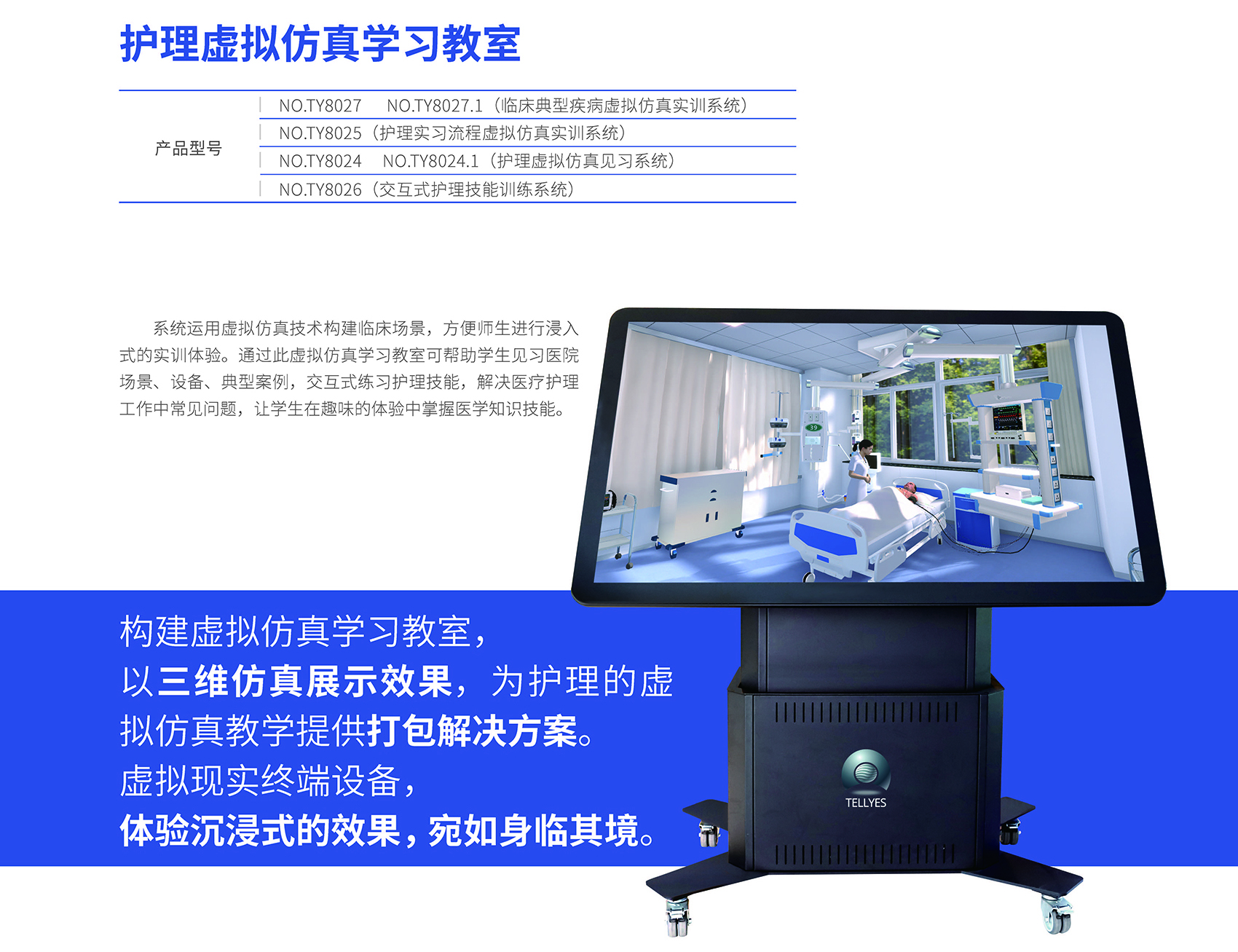 - 產(chǎn)品型號 NO.TY8027 NO8027.1(臨床典型疾病虛擬仿真實(shí)訓(xùn)系統(tǒng))丨NO.8025(護(hù)理實(shí)習(xí)流程虛擬仿真實(shí)訓(xùn)系統(tǒng))丨NO.TY8024 NO.8024.1(護(hù)理虛擬仿真見習(xí)系統(tǒng))丨NO.TY8026(交互式護(hù)理技能訓(xùn)練系統(tǒng))
